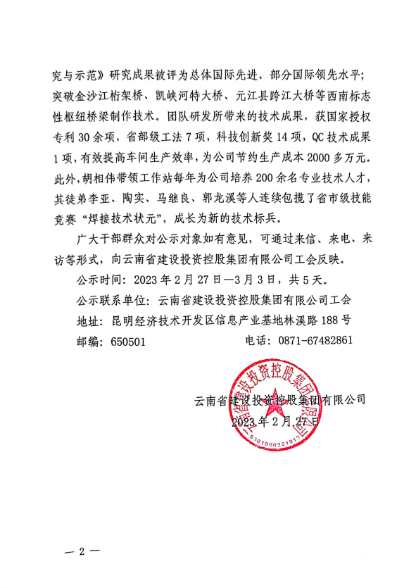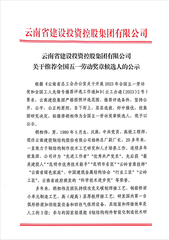 云南省建設投資控股集團有限公司關于推薦全國五一勞動獎章候選人的公示