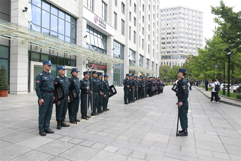 演練假定3名男子因經(jīng)濟(jì)糾紛,從集團(tuán)西門強行闖入,值班保安帶著警棍前往勸阻要求登記,3名男子突然拔出尖刀,砍向保安,意欲沖入單位。值班保安迅速集結(jié),與3名男子周旋、搏斗,贏得救援時間。反恐防暴指揮部迅速啟動反恐防暴應(yīng)急工作程序,應(yīng)急組、疏散組、警戒組、支援組、監(jiān)控組、通訊組人員迅速就位,及時向水海子派出所報警求助,將現(xiàn)場情況匯報集團(tuán)信訪維穩(wěn)工作部和物業(yè)公司相關(guān)負(fù)責(zé)人。在現(xiàn)場應(yīng)急調(diào)度之下,各小組全力協(xié)作、控制事態(tài)惡化,迅速抓獲暴恐分子,應(yīng)急演練任務(wù)圓滿完成。