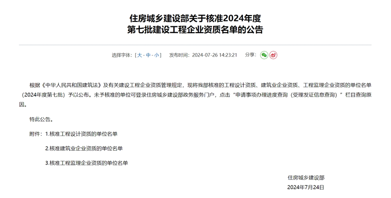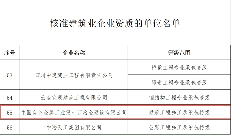 7月26日,國家住房和城鄉建設部發布關于核準2024年度第七批建設工程企業資質名單的公告,集團十四冶公司申特成功,獲建筑工程施工總承包特級資質。至此,十四冶公司成為集團第10家擁有特級資質的企業,集團特級資質增至12項。