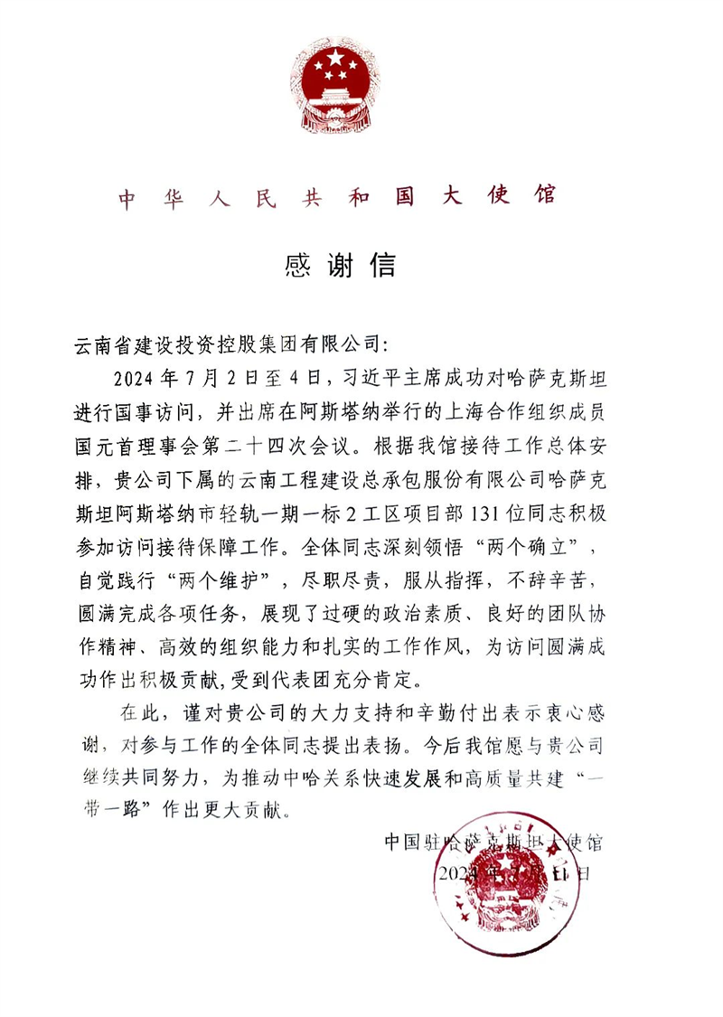 信中指出,2024年7月2日至4日,習近平主席成功對哈薩克斯坦進行國事訪問,并出席在阿斯塔納舉行的上海合作組織成員國元首理事會第二十四次會議。根據使館接待工作總體安排,集團下屬云南工程建設總承包股份有限公司哈薩克斯坦阿斯塔納市輕軌一期一標2工區項目部131位同志積極參加訪問接待保障工作。全體同志深刻領悟“兩個確立”,自覺踐行“兩個維護”,盡職盡責,服從指揮,圓滿完成各項任務,展現了過硬的政治素質、良好的團隊協作精神、高效的組織能力和扎實的工作作風,為訪問圓滿成功作出積極貢獻,受到代表團充分肯定。
