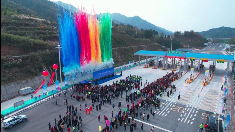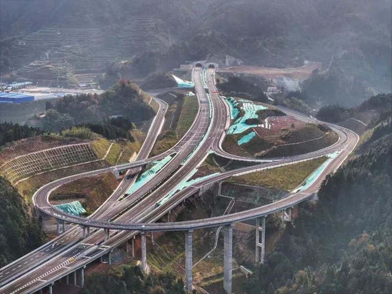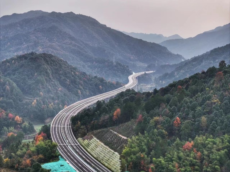 高架橫跨山川,隧道穿越峽谷,車流的轟鳴聲穿梭在流動的鋼鐵叢林,翠綠的樹影在光影下勾勒出靜謐壯美的畫面。地勢高低,山巒起伏,在這條斑斕的路途上,人們的憧憬在遠方悄然升起,形成一幅共筑美好未來的長篇畫卷。