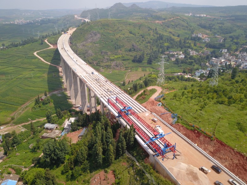 該橋為宣威至富源高速公路主線橋梁,因跨越低洼谷、河流及現狀鄉村道路而設。上部結構設計為6聯,含40米T梁145片,采用先簡支后連續形式;下部橋墩為雙柱墩+樁基礎,共設20顆空心墩,最大墩高65米。
