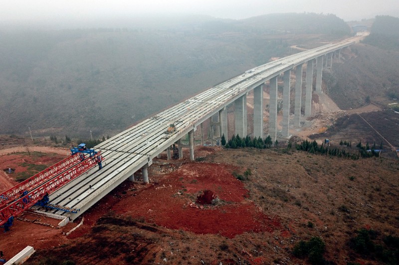 出水洞河大橋為跨越低洼谷地及現狀鄉村道路而設,橋梁下部由圓柱墩及空心墩組成,空心墩共822.5米,其中左右幅6#、7#、8#為全線最高墩,墩高70米。上部左幅4聯,右幅4聯,共27跨,先簡支后連續預應力混凝土T形梁橋,橋梁左幅長526.08米,右幅566.08米,共有40米T梁135片。