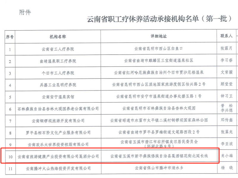近日,云南省總工會(huì)公布了23家單位為云南省職工療休養(yǎng)活動(dòng)第一批承接機(jī)構(gòu),集團(tuán)下屬云南省旅游健康產(chǎn)業(yè)投資有限公司戛灑分公司(即戛灑外灘豪生酒店)入選。