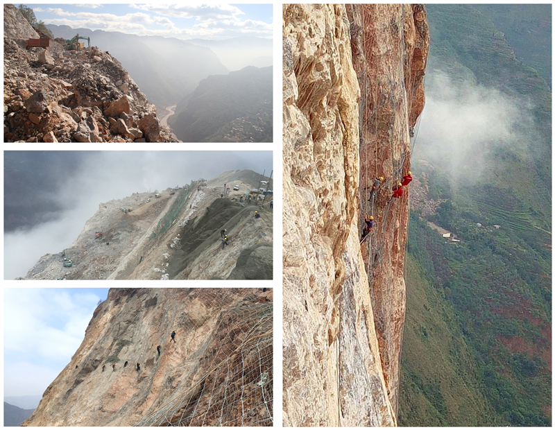 針對620米高陡邊坡整治重大課題,黨員干部與技術骨干克服余震多、坡度陡、場地窄、風險高、任務重、除險加固難度大等難題,會同參建單位現場研討、集中攻關,有針對性地采用高邊坡二次預裂及弱拋擲爆破技術,對相應風險等級區域進行單點爆破除險和大面積爆破除險,并采用高空“蜘蛛人鋪設主動防護網+噴射混凝土”表層噴錨技術和深層預應力錨索技術,對高陡邊坡進行加固治理。同時,采取嚴格管制交通、封閉施工、加強安全監測預警和聯防聯動等有力措施,最終成功攻占峰頂。如今,約1千米長、依崖懸空而建的施工棧道被保留下來,仍在見證創業之艱。
