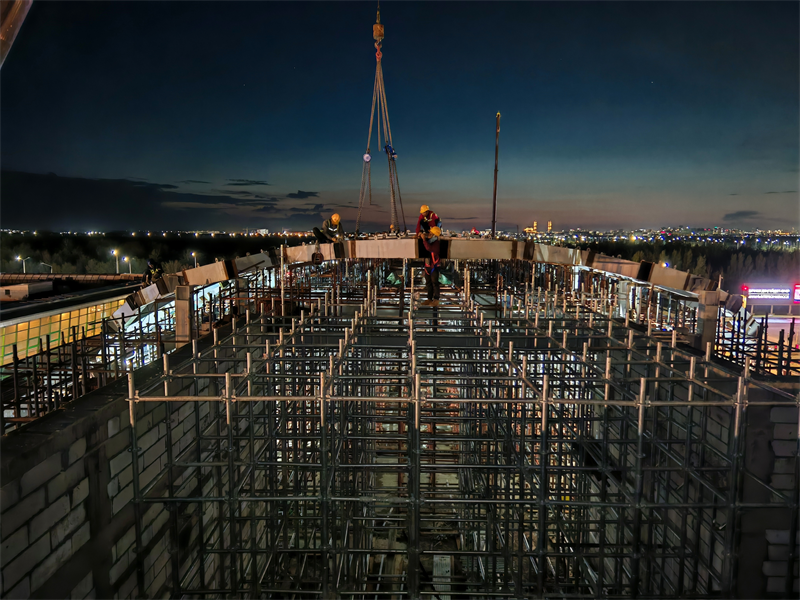 2023年9月6日,項目控制性工程——首聯現澆箱梁拉開施工序幕。為了確保此次澆筑圓滿完成,項目團隊積極與當地有關單位溝通協調,提前測算各種材料的綜合到場時間,并對施工方案進行多次調整優化,確保澆筑期間的材料供應鏈、施工鏈高效銜接。在管理人員的輪班接力下,1380立方米混凝土在20小時內完成連續澆筑,刷新了全線現澆箱梁澆筑方量最大、用時最短的全新記錄。