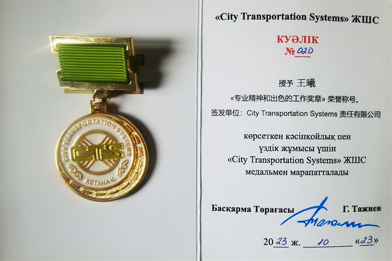 2023年10月,阿斯塔納輕軌項目榮獲業主城市交通系統有限公司表彰。其中,項目員工李元、趙靖洋、鄧向逵、錢慶鼎、喬凱5人榮獲表揚信,楊俊、徐文武獲“專業精神和出色工作”胸章,王曦、李剛獲“專業精神和出色工作”獎章。