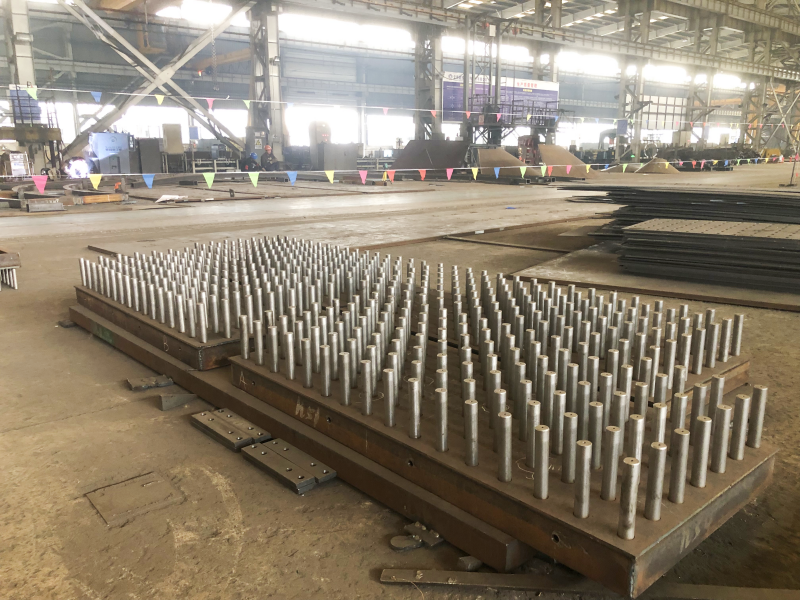 空氣分布板位于焙燒爐風箱與殼體第一節段之間,是爐體中氣流能夠均勻分布和流動的重要保證,全爐160個空氣分布板包含27種規格,17000余顆風帽焊接其中,風帽垂直度偏差、平面度偏差、整體尺寸偏差均需控制在1毫米范圍內,相比常規橋梁板單元5毫米的平面度允許偏差值,制作要求更為嚴格,是全爐制作難度最大、質量要求最高的構件形式。面對嚴峻挑戰,鋼構公司開展多次試制試驗,在高精度定制工裝、最小化焊接電流、數控式機械矯正的多重保障下,提高制作質量,得到了業主、施工方的一致認可和高度贊揚。