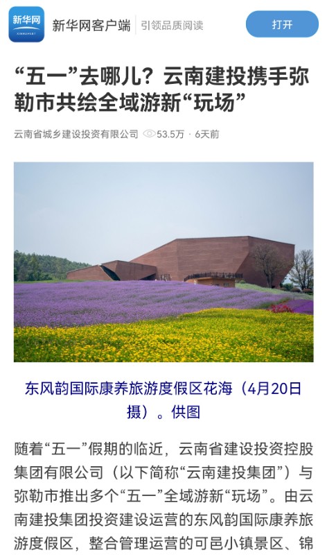 其中,東風(fēng)韻國(guó)際康養(yǎng)旅游度假區(qū)“五一”花海狂歡節(jié)屢次登上央視,在CCTV1新聞聯(lián)播、CCTV13新聞直播間、東方時(shí)空、共同關(guān)注等欄目播出,全國(guó)觀眾通過(guò)央視鏡頭,更直觀感受“有一種叫云南的生活”。多平臺(tái)、多領(lǐng)域KOL自媒體分享者引爆網(wǎng)絡(luò)熱點(diǎn)數(shù)十萬(wàn)次,實(shí)現(xiàn)多平臺(tái)圖文視頻宣推跨平臺(tái)聯(lián)動(dòng)400+次。