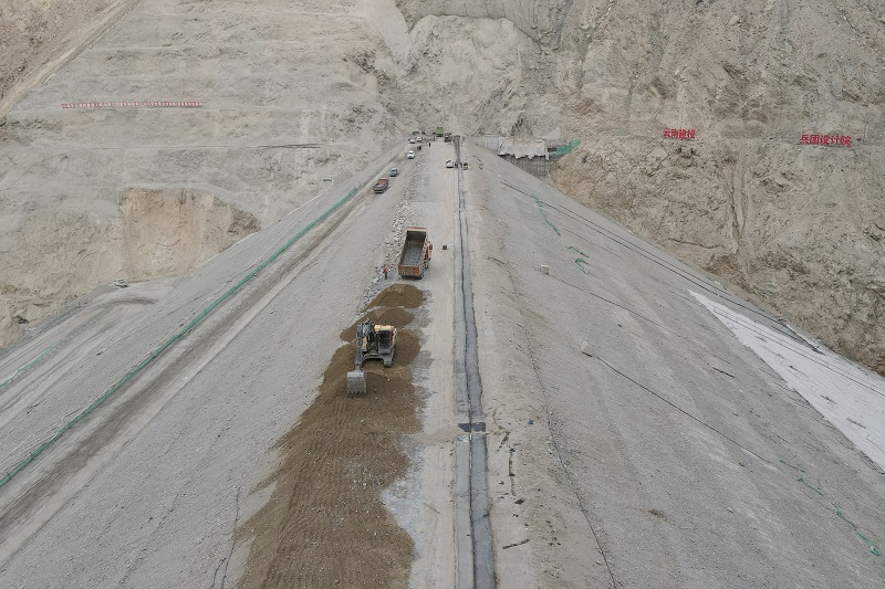 隨著填筑的進度不斷加快,尼雅水庫大壩如破土的春筍一般,不斷長著“個子”。2021年10月26日,瀝青混凝土心墻攤鋪突破百層大關;2022年11月19日,累計完成填筑量437.08萬立方米,實現(xiàn)大壩封頂目標。