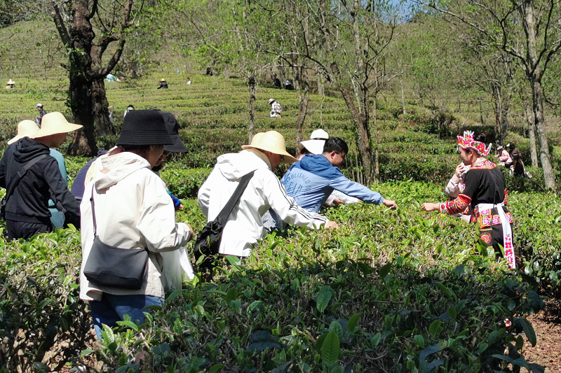 “采茶要采‘兩葉一尖’,葉子嫩的話,‘三葉一尖’也可。采摘的時候,用拇指和食指輕輕地挾住葉間幼梗的中部,往上一提便摘好了。”在采茶師的講解中,青年們穿行在茶樹綠林間,一邊欣然“拔尖兒”,一邊分享采茶心得。伴隨著歡聲笑語,一片片青綠從指尖收攏到掌中,成把的茶葉灌入背后的小背簍中。