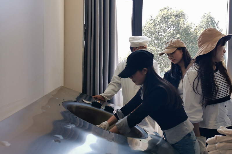 在茶葉生產車間,青年們邊聽邊學邊看,在制茶師的帶領下體驗了揉茶、炒茶等手工茶葉制作流程,并就茶葉采摘、攤晾、殺青、揉捻、干燥、壓餅、包裝等工藝流程與制茶師進行了交流。